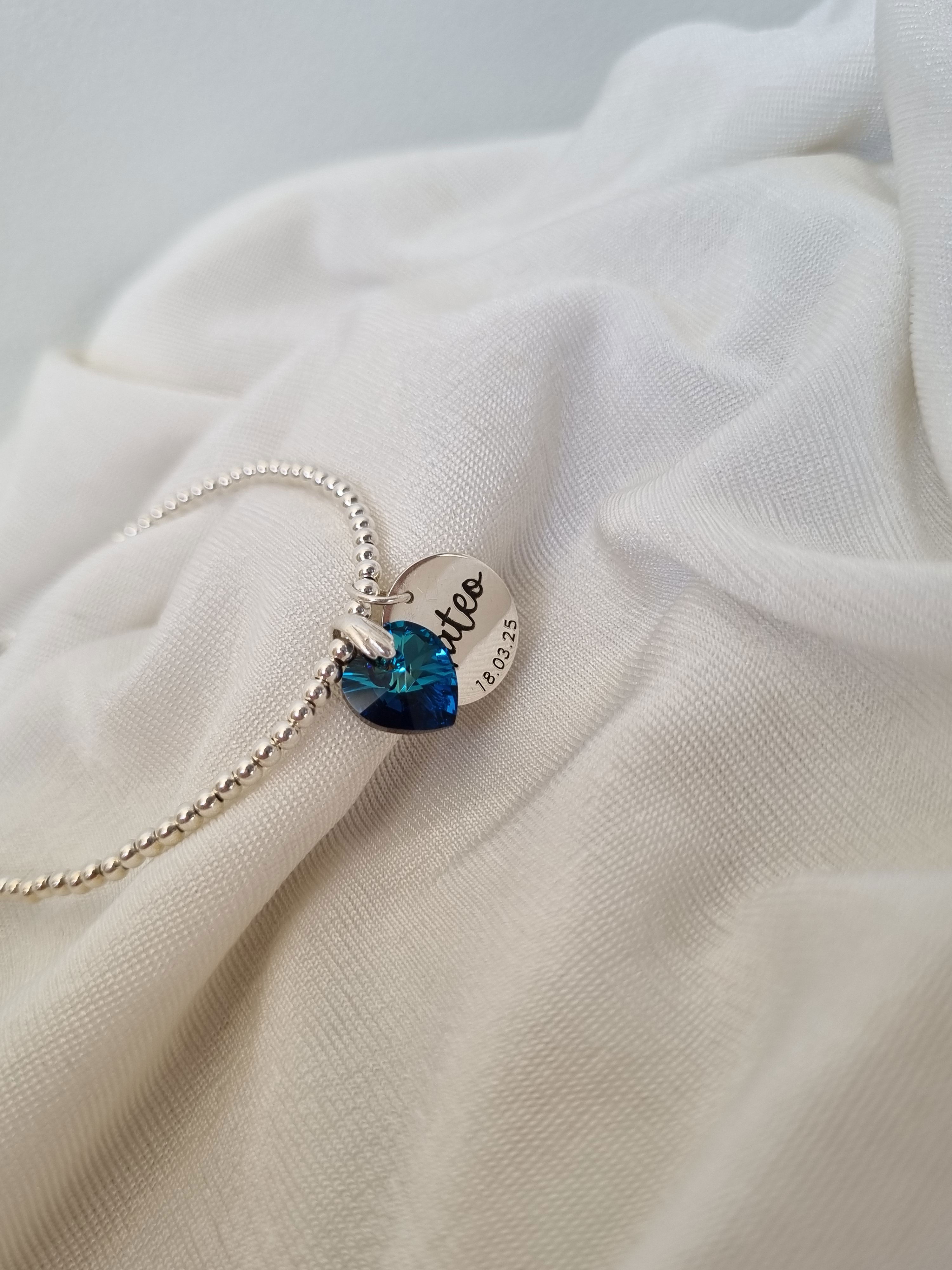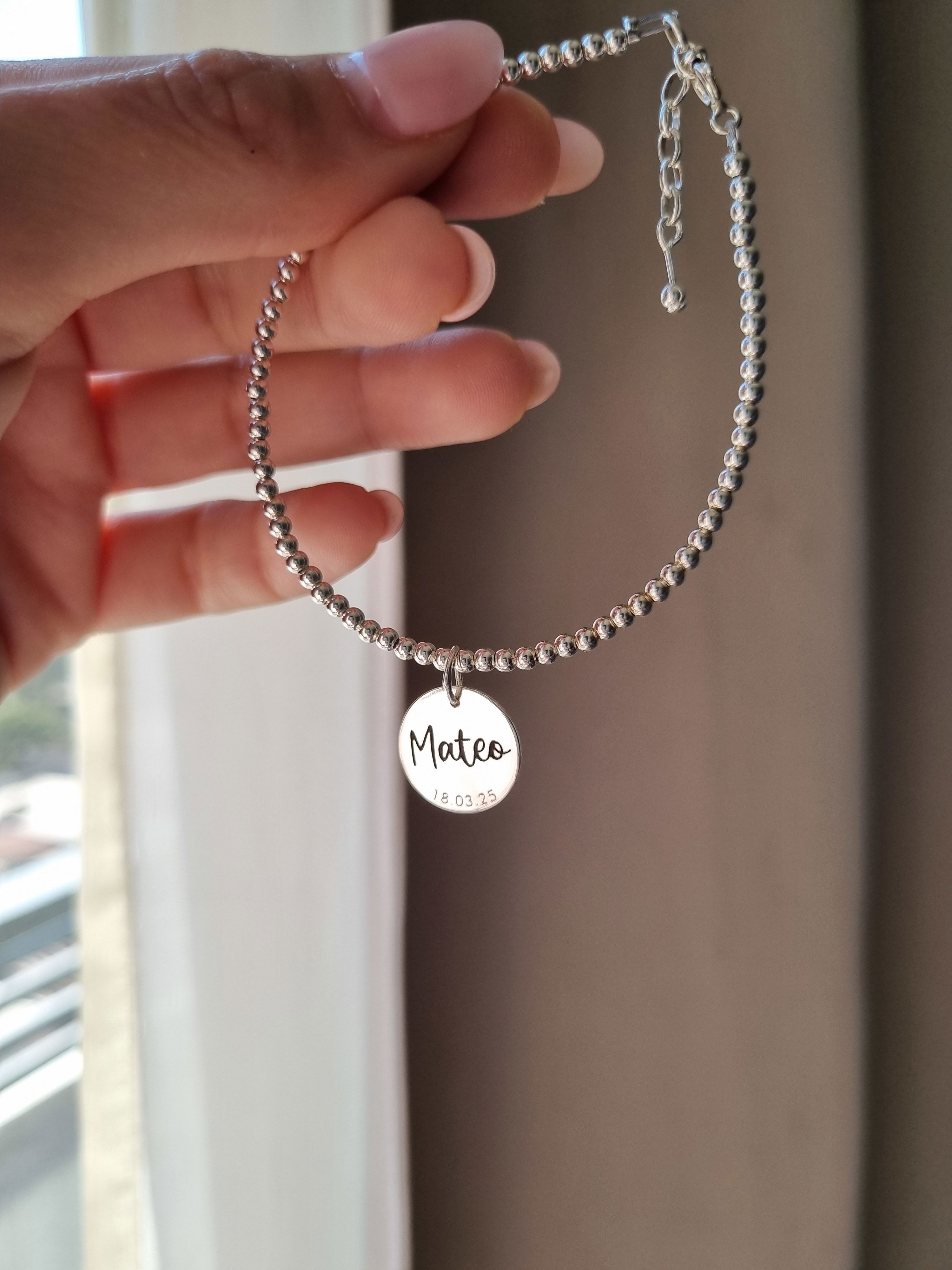 Pieza: Pulsera de bolitas de 17cm con extensión de 3cm + Chapita/s circulares de 1cm diámetro + Dije corazón